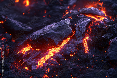 black rocks surrounded by red-hot lava in a hellish landscape, close-up, high-angle view, with colorful light effects, low contrast, hyper-realistic, highly detailed.