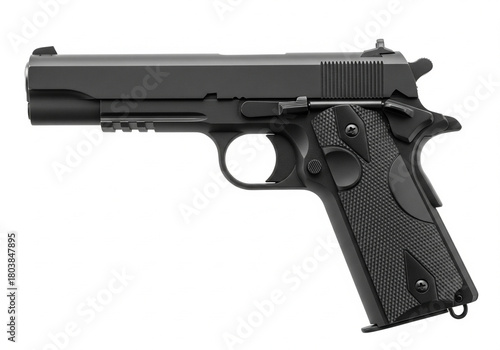Black semi-automatic handgun, a pistol firearm for self-defense isolated on white background