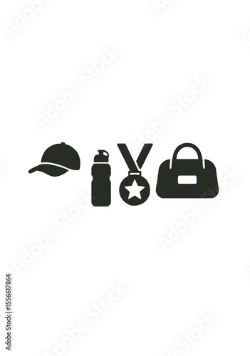 Black Silhouette Icons of Sports Accessories Including Cap, Water Bottle, Medal and Gym Bag Representing Fitness, Competition, and Athletic Lifestyle