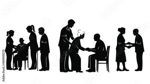 Black silhouette illustrations of diverse people interacting in various business and social scenarios with professionals shaking hands and exchanging documents