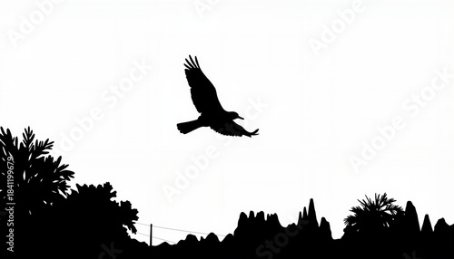 Black silhouette of a bird flying over palm trees at sunset, World Wildlife Day
