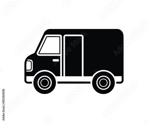 Black silhouette of a delivery van with open door and wheels on white background truck cargo van
