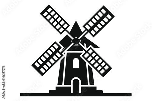 Black silhouette shows a striking windmill icon against a plain background, simple and captivating