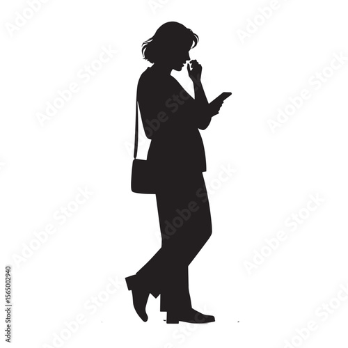 Black Silhouette Vector of Woman Talking on Mobile Phone While Standing in Casual Communication Scene on White Background Full Ultra HD