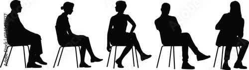 Black silhouettes of diverse business people sitting on chairs, waiting for interview, meeting, conference, isolated on white background vector.