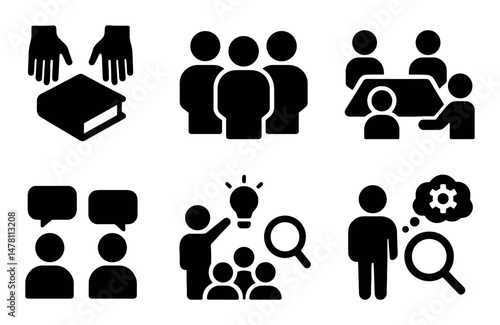Black silhouettes of people, books, and symbols in various activities