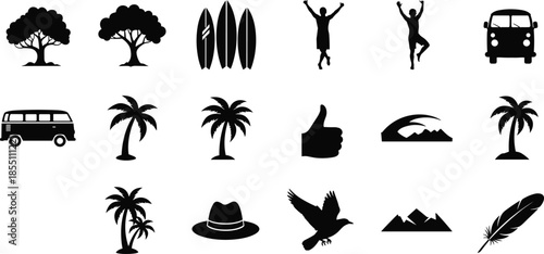Black silhouettes of trees, surfboards, people, vans, palm trees, mountains, and a hat