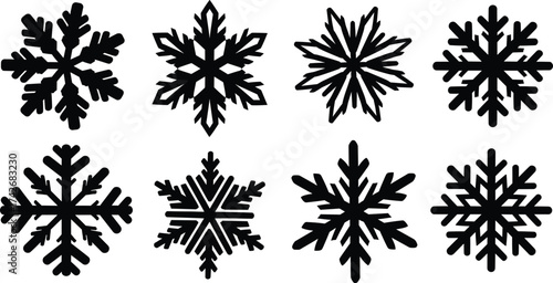 Black snowflake vector, winter ice crystal silhouette, festive ornament design, holiday decoration set, seasonal icon, symmetrical illustration, cold graphic