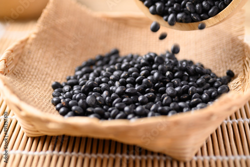 Black soybean seeds pouring in basket, Food ingredients