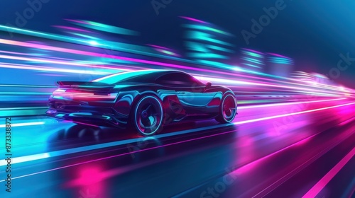 Black Sports Car Speeding Through Neon City