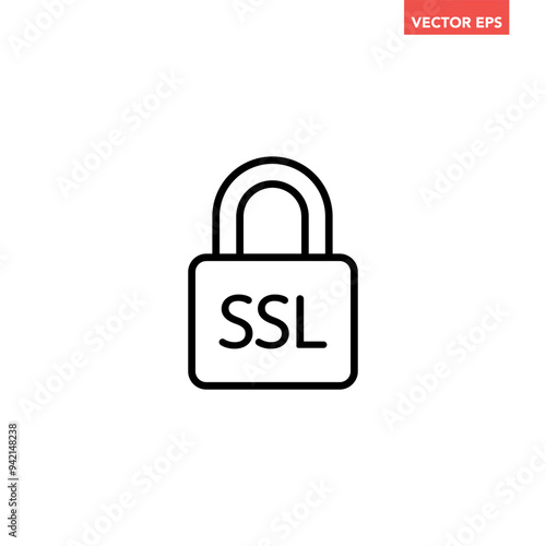 Black SSL lock line icon, simple digital secured cyber security flat design pictogram vector for app ads web banner button ui ux interface elements isolated on white background