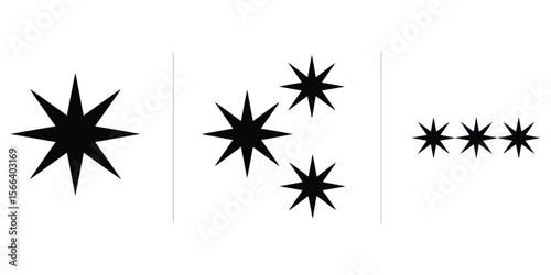 Black Star Icon Set on White, Eight Pointed Star Silhouette Design Elements