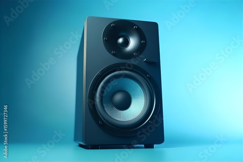 Black Studio Monitor Speaker on Blue Background: Professional Audio Equipment for Music Production & Sound Engineering