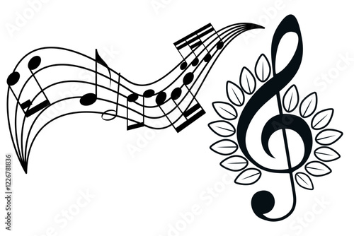 Black treble clef sign, decorated music key symbol, musical melody illustration, notes sound icons. Musical background, design fest card, jazz poster, concert performance banner. Copy space, isolated