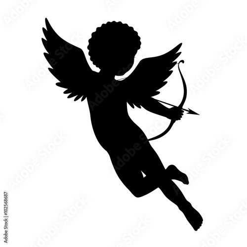 Black vector silhouette of a cupid shooting arrow. Isolated on white.