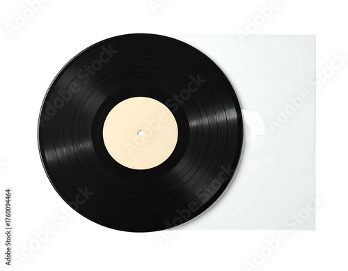 Black vinyl record with a blank center label in a white sleeve, isolated on black