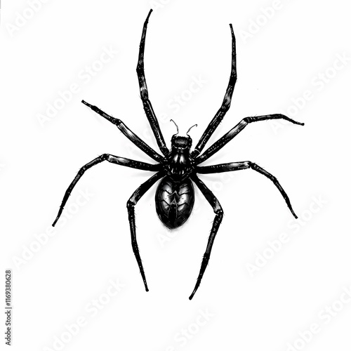 Black Widow Spider: A detailed, high-resolution photograph of a black widow spider, showcasing its distinctive black body and red hourglass marking. Perfect for nature, science.
