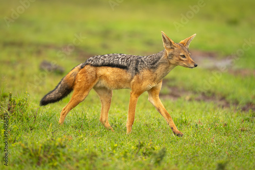 Black-backed jackal crosses wet grass lifting forepaw