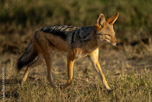 Black-backed jackal trots over savannah in sunshine