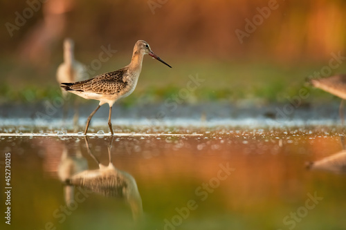 Black-tailed godwit (Limosa limosa), with beautiful orange background. Colorful shorebird with brown and black feathers in the lake. Wildlife scene from nature, Hungary