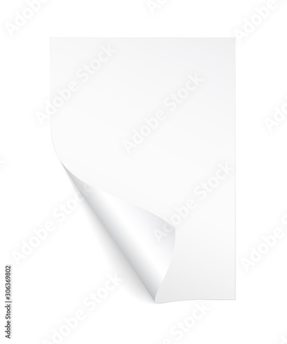 Blank A4 sheet of white paper with curled corner and shadow, template for your design. Set. Vector illustration