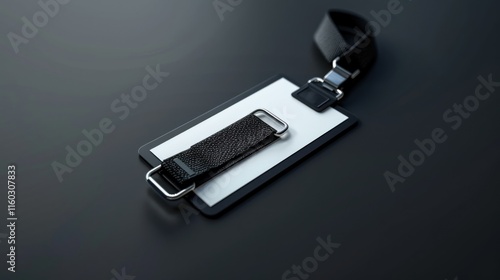 Blank black ID card holder with lanyard on dark surface.
