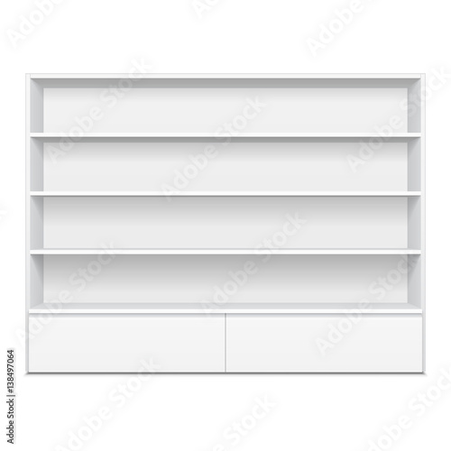 Blank Empty Showcase Display With Retail Shelves. 3D. Front View. Mock Up, Template. Illustration Isolated On White Background. Ready For Your Design. Product Advertising. Vector EPS10