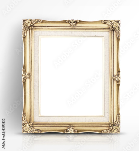 Blank golden vintage photo frame lean at wall in glossy white st