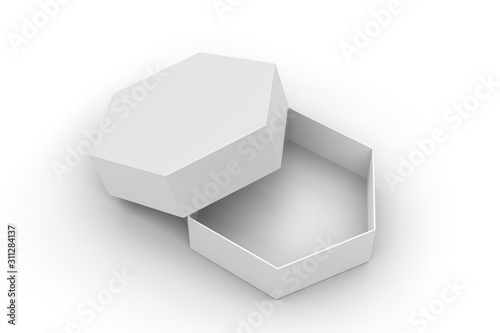 Blank hexagonal paper hard box for gift items and branding, 3d render illustration.