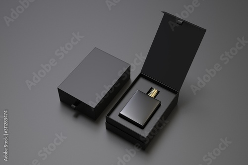 Blank perfume bottle in hard box for branding, 3d render illustration.