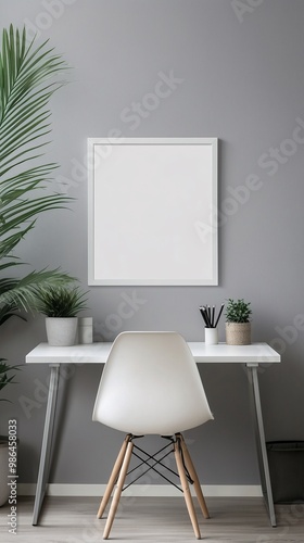 blank photo frame mockup on grey wall with minimal white desk and plant decorating