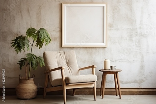 Blank picture frame mockup on a wall in a rustic interior. Artwork template mock-up in interior design. View of modern boho-style interior with chair