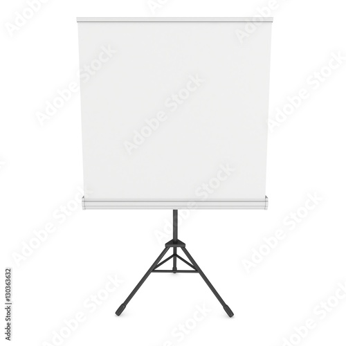 Blank Roll Up Expo Banner Stand on Tripod. Trade show booth white and blank. 3d render illustration isolated on white background. Template mockup for your expo design.