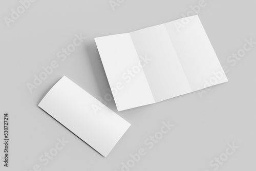 Blank tri fold cover flyer on gray background. 3D illustration with soft shadows for mockup. 3d render
