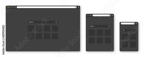 Blank web browser window with toolbar and search field. Modern website, internet page in flat style. Browser mockup for computer, tablet and smartphone. Adaptive UI, dark mode. Vector illustration