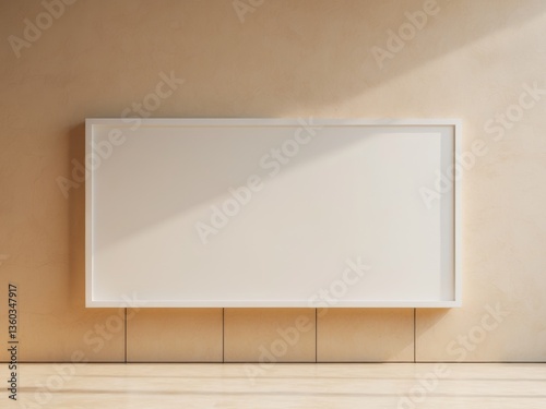 Blank white billboard hanging beige wall is rectangular on the background.