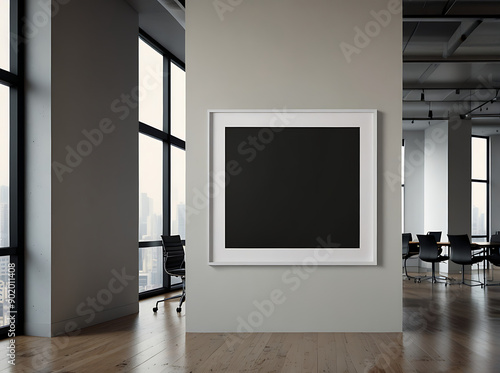 Blank white poster on light grey wall in modern open space office.