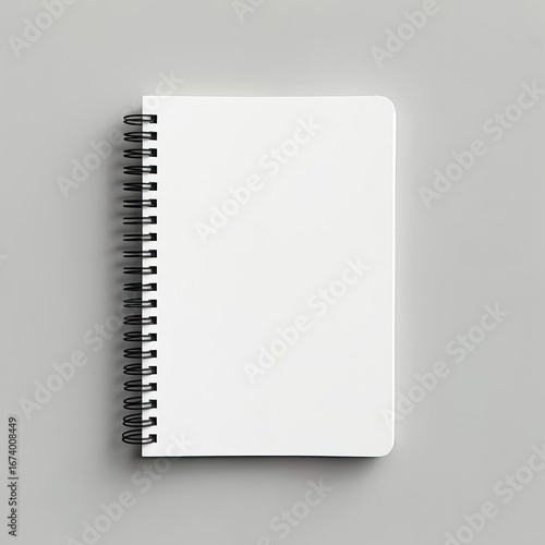 Blank white spiral bound notebook rests on clean light grey background. Realistic notepad mockup offers empty pages for writing, drawing, planning. Ideal for business, office, personal use, provides
