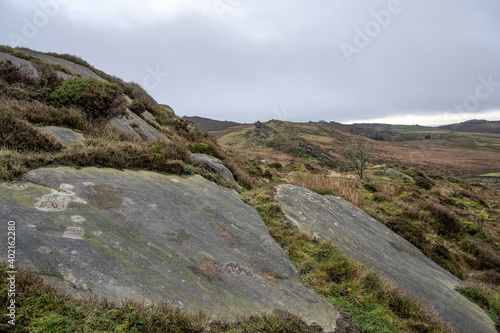 Bleak winter panoramic view of Gib Torr, and The Roaches in the Peak District National Park.