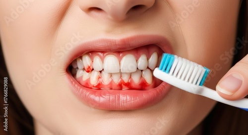 Bleeding and Inflamed Gums with Toothbrush Close-up.