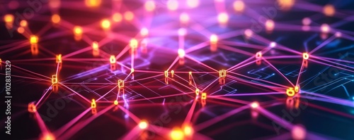 Blockchain network visualization, neon circuit patterns, dark background, digital connections
