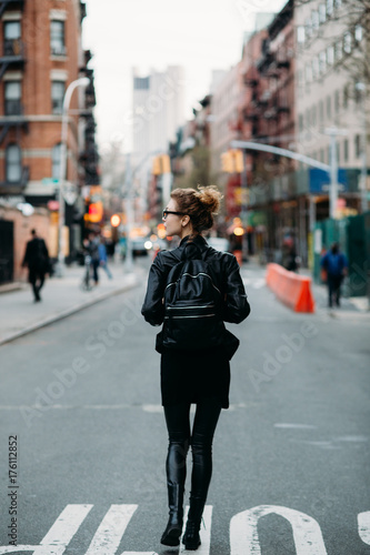 Blond woman walking down the street in NYC, back view.