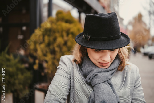 Blonde business woman in elegant autumn outfit with hat and scarf enjoying city street atmosphere