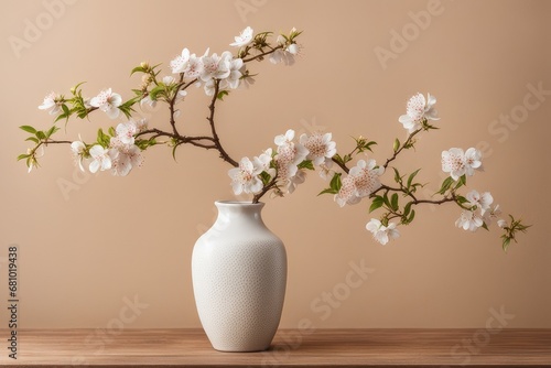 Blooming branch in ceramic vase on wooden table against beige stucco wall with copy space. Home interior background of living room