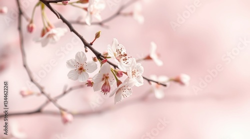 Blooming Cherry Branch Close Up with Soft Pink Blurred Background