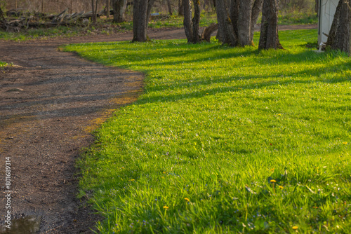 Blooming grass early spring woodland, selective focus background image