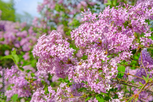 Blooming lilacs in a vibrant garden during springtime sunlight