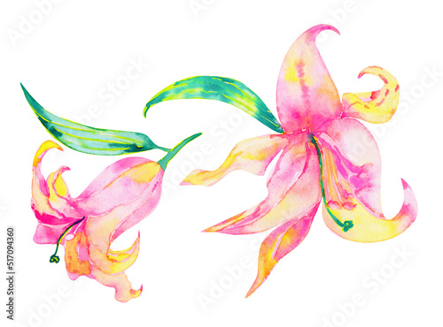 Blooming lily, watercolor buds with leaves, pink flowers isolated on white