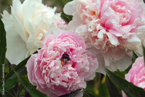 Blooming lush white pink delicate peonies in full bloom against a background of green leaves. Delicate summer flowers, natural background.