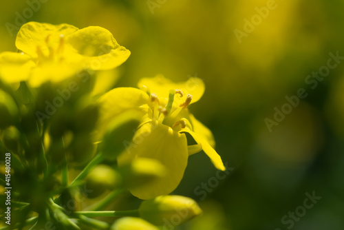 Blooming rapeseed (Brassica napus) field in Poland. Macro shot on flowers. Closeup.